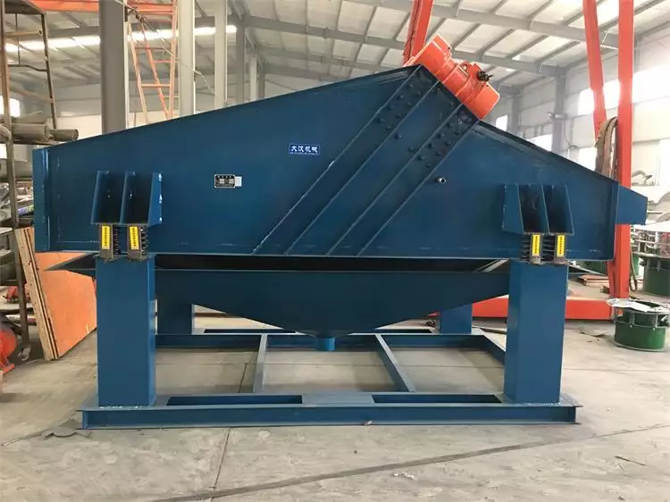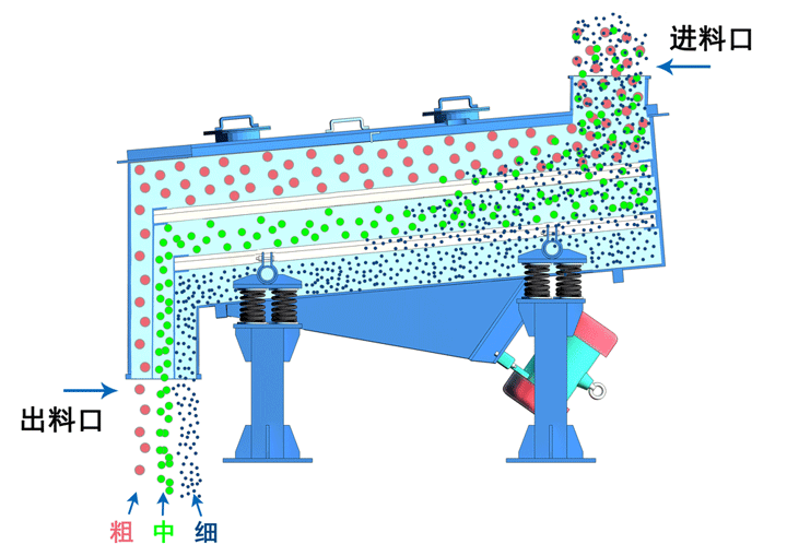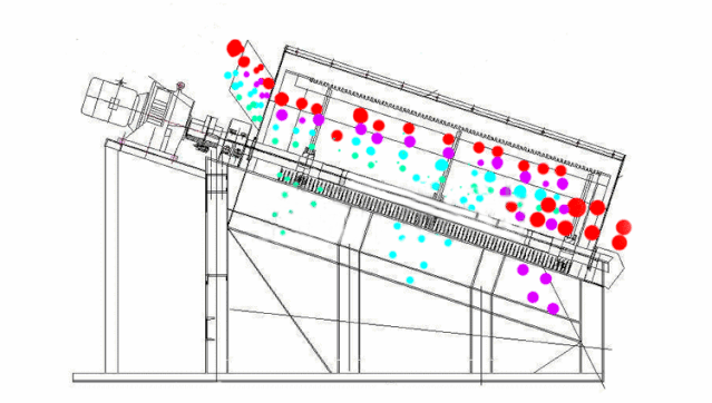 電機(jī)通過三角帶使激振器的偏心塊高速旋轉(zhuǎn),運(yùn)行的偏心塊產(chǎn)生很大的離心力,刺激篩箱產(chǎn)生一定幅度的圓周運(yùn)動,篩上的物料在傾斜的篩面上受到篩箱傳遞的沖量,產(chǎn)生連續(xù)的拋擲運(yùn)動,物料與篩面相遇的過程使小于篩孔的顆粒通過篩網(wǎng),從而實(shí)現(xiàn)分級。