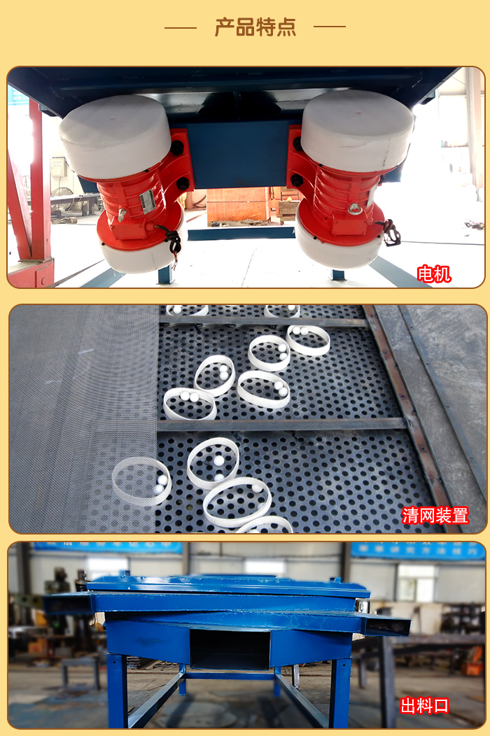 本篩機主要由篩箱、篩框、篩網、振動電機、電機臺座、減振彈簧、支架等組成。